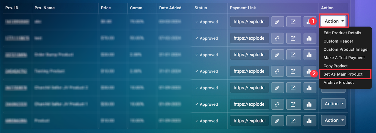 A Product can be set as a Main Product by clicking on Action and then selecting Set as Main Product in the Products section of your seller account.