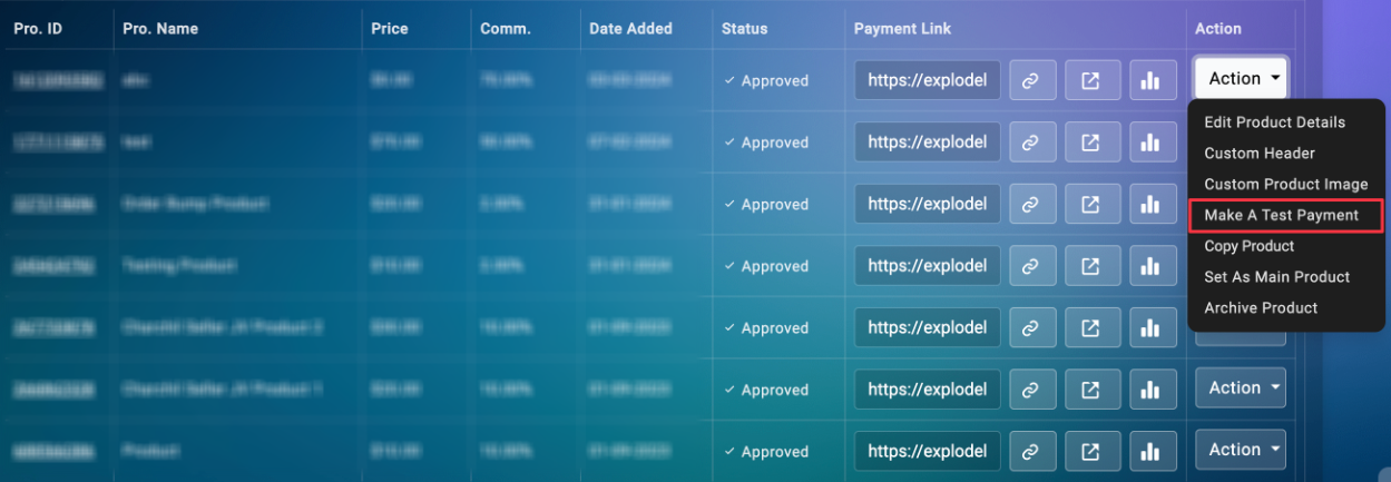 Explodely provides a quick and easy way to test your product's payment link using test credit cards so that you don't have to make actual purchases for both One Time and Subscription (Products with rebills) products.