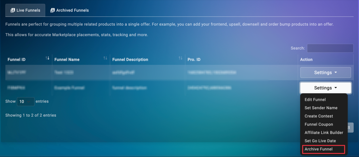 2. Archive Funnel: You can archive a funnel when it’s no longer active. To do so, go to Archive Funnel under Settings.