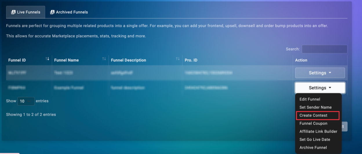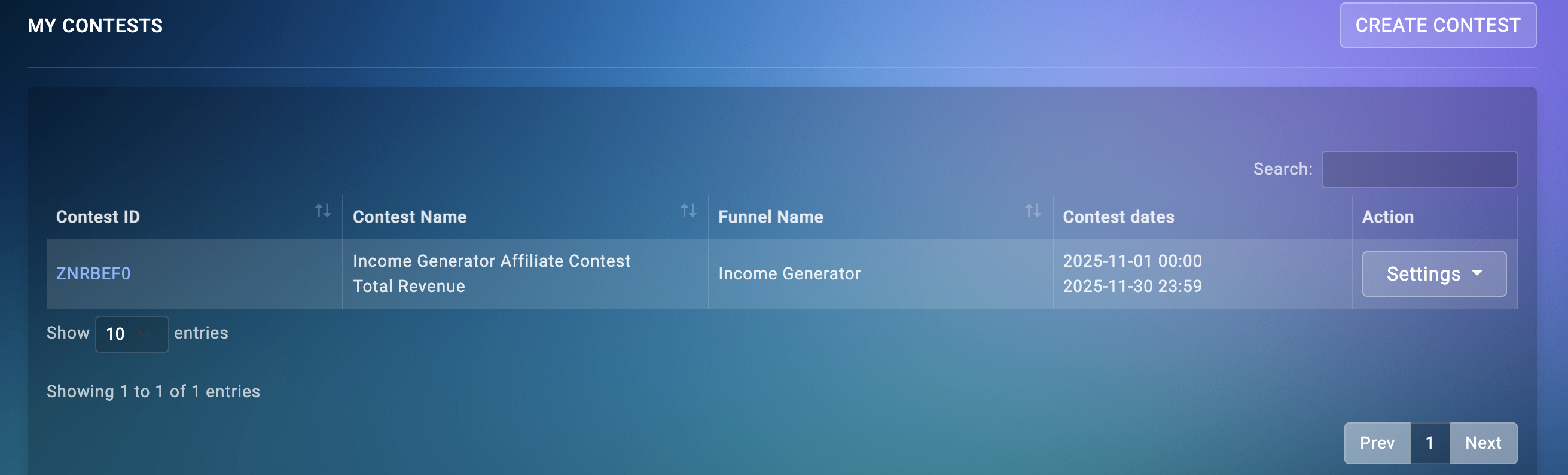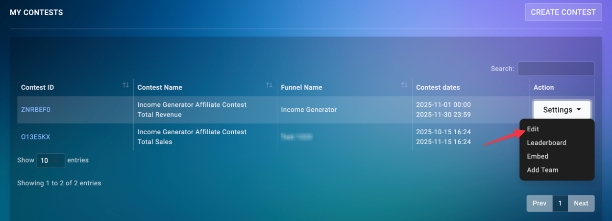 Locate the funnel where you want to set up a contest. Under the Settings section of that funnel, click on Create Contest.