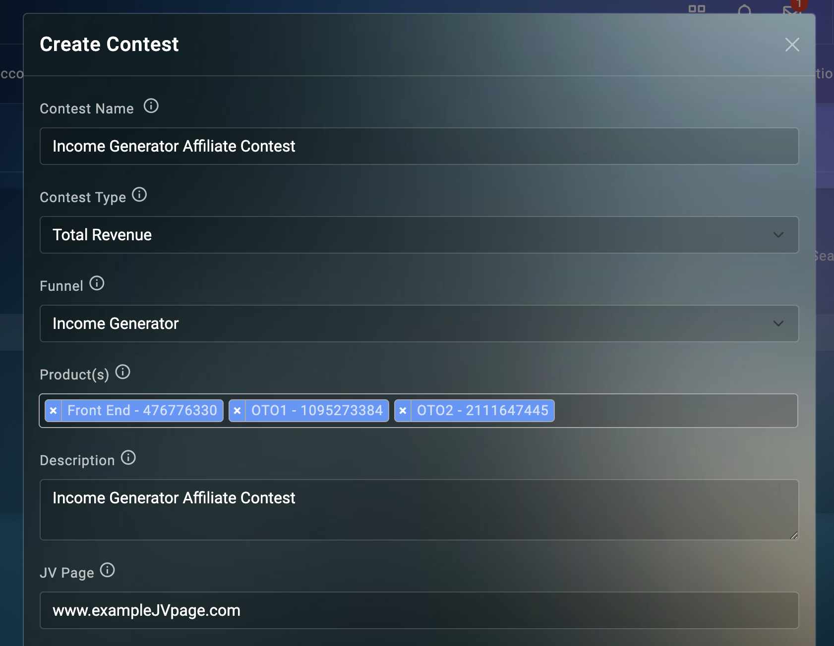 A pop-up window will appear — fill in all the required details like Contest Name, Type, Funnel, Products you want to run the contest for, Description, JV Page URL, Start and End Date with time.