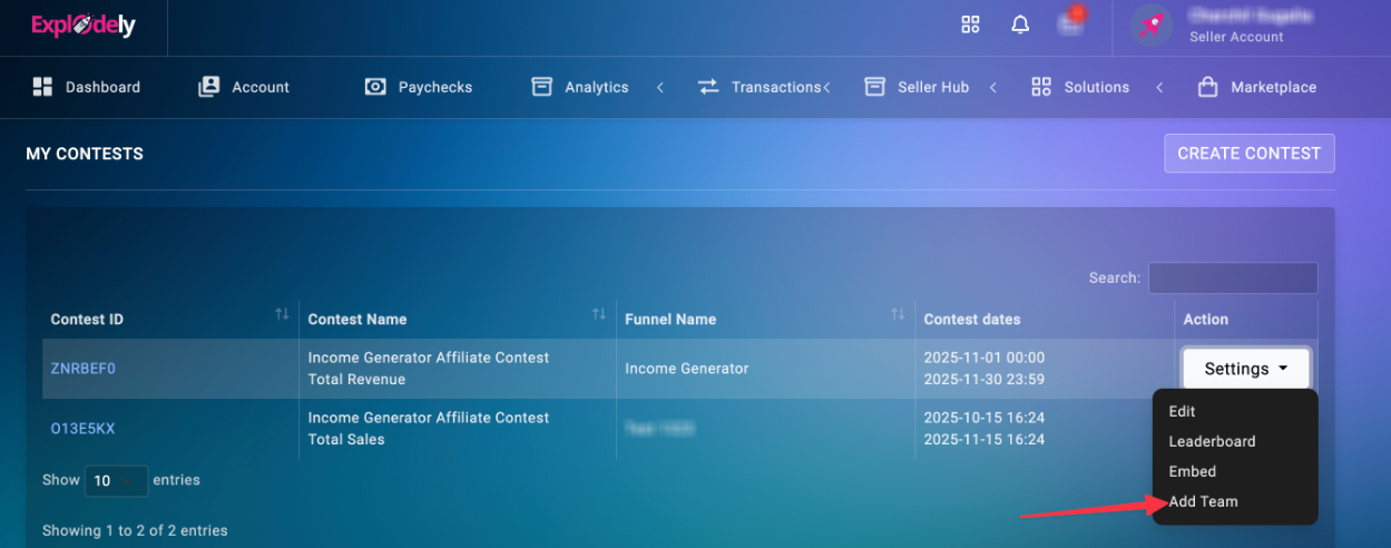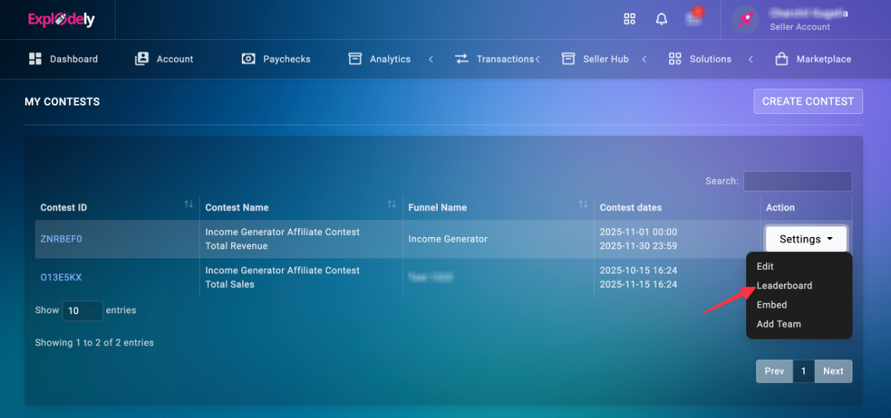 To create a contest for your funnel, log in to your account and go to Seller Hub → Funnels.