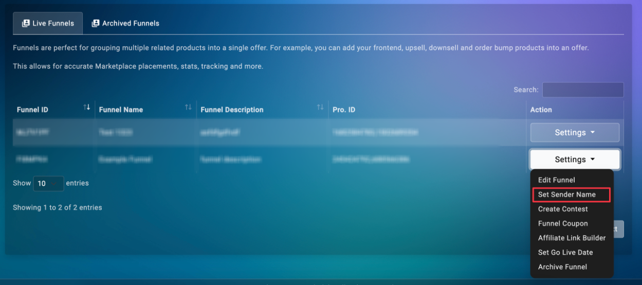 Locate the funnel for which you want to set the sender name. Under the Settings section, click on Set Sender Name.