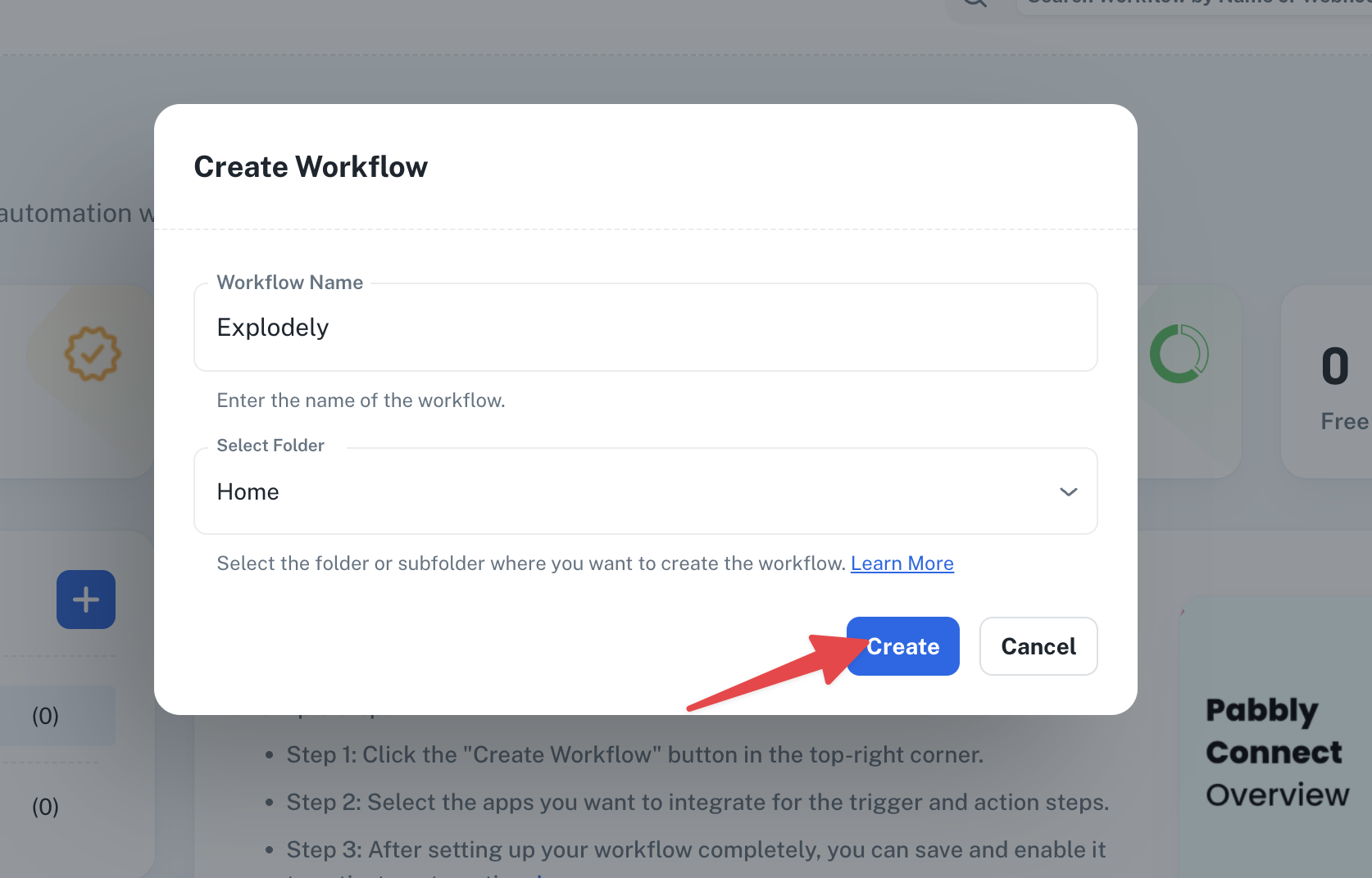 3. Enter your Workflow Name, select the folder where you want to save it, and click Create.