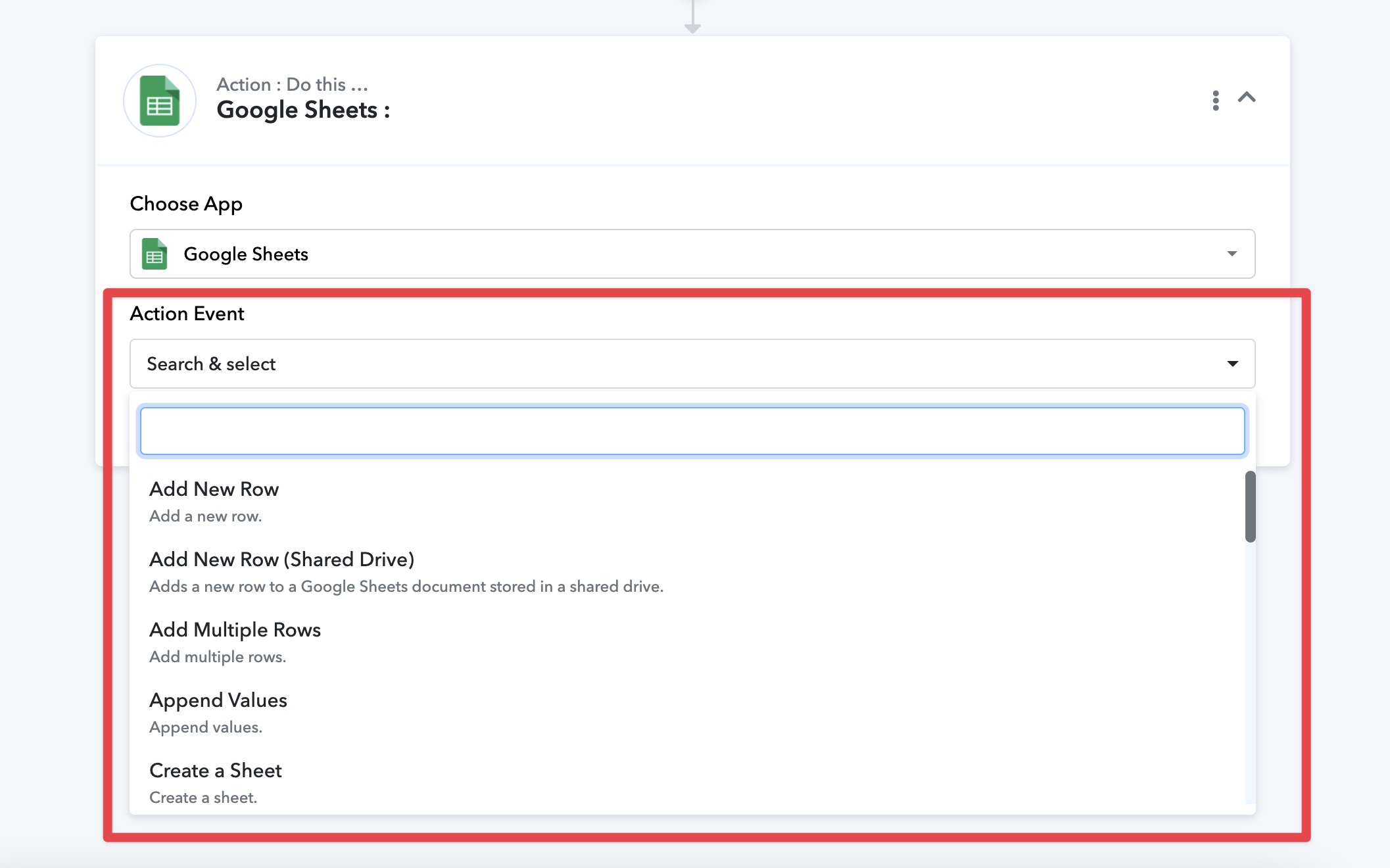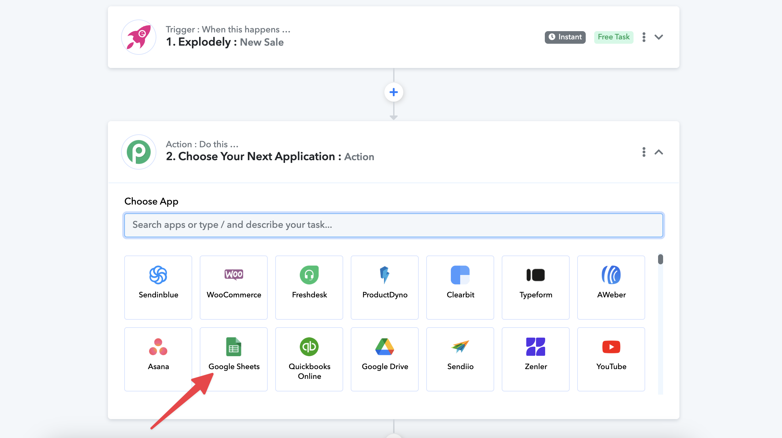 1. In Pabbly, choose the Action App you want to connect Explodely with. For example, if you’re connecting with Google Sheets, select it from the list.