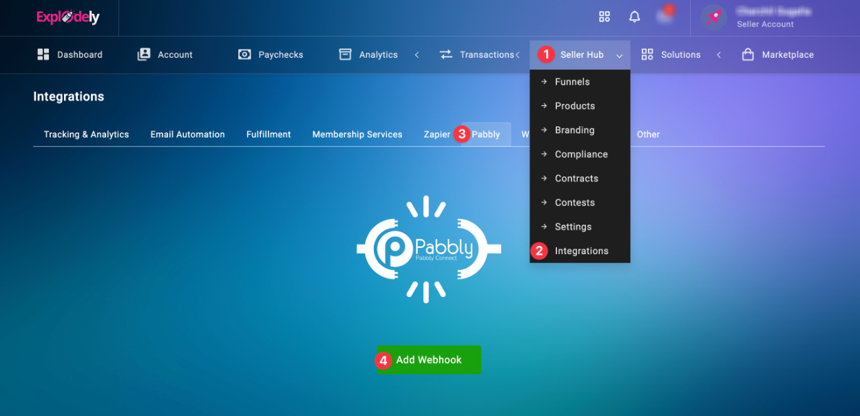 1. Log in to your Explodely account then go to Seller Hub-> Integrations-> Pabbly.
