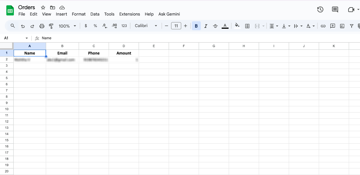 After the test completes, the test sale data from Explodely will appear in your selected Google Sheet.