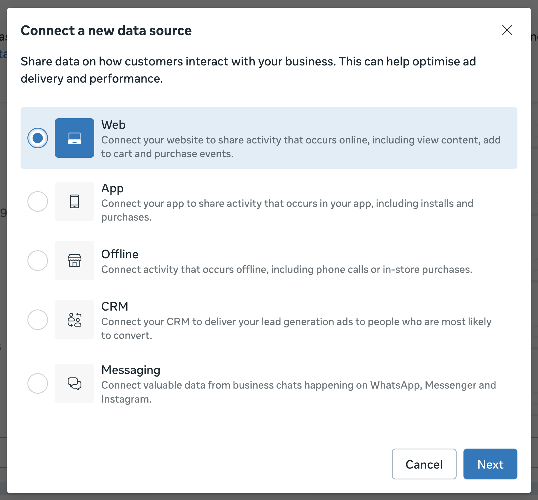 1. Open your Meta Business Suite and go to Events Manager. On the left sidebar, click Connect Data-> Overview.