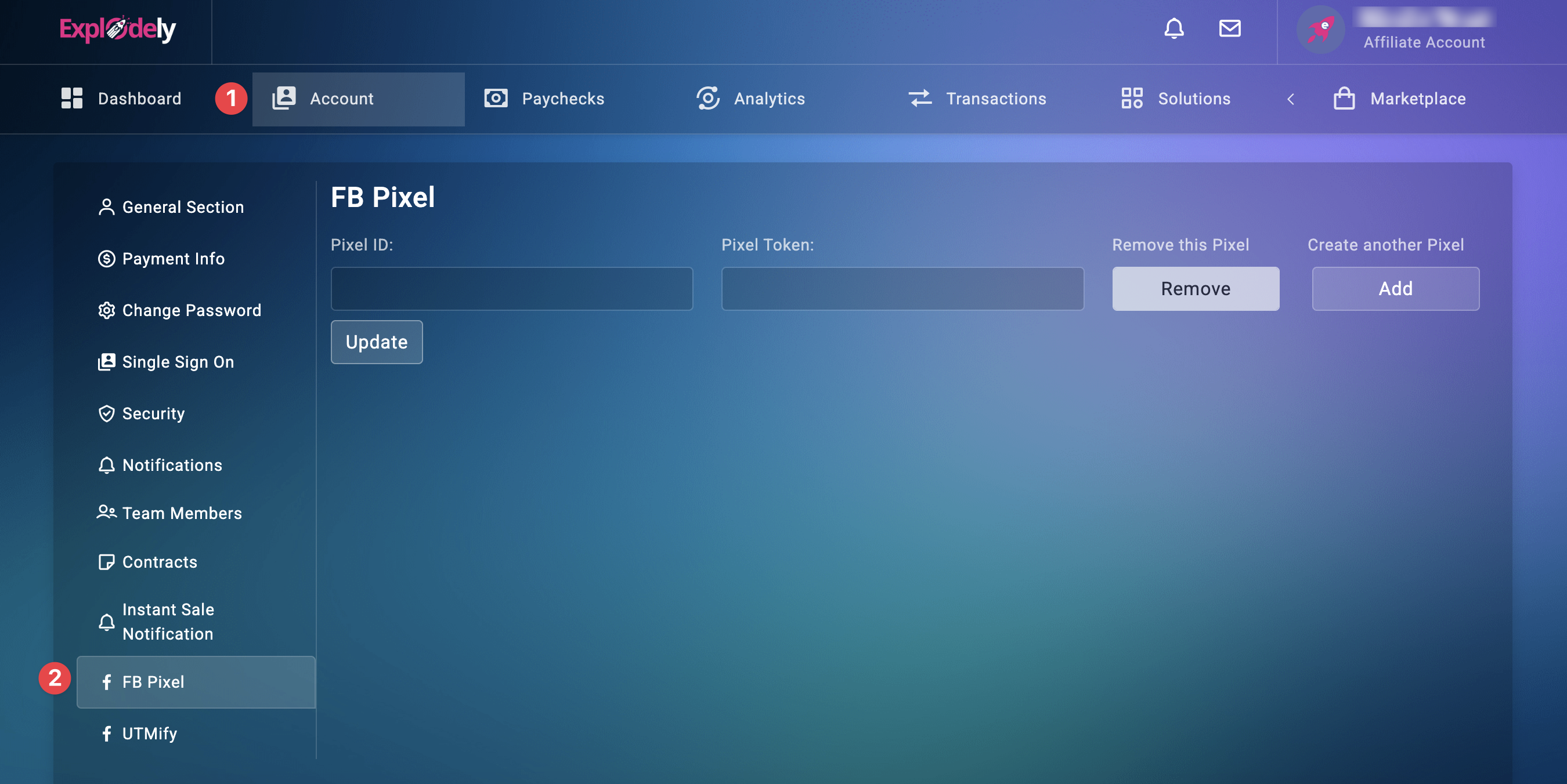 1. Log in to Your Affiliate Account. Then go to Account and navigate to FB Pixel.
