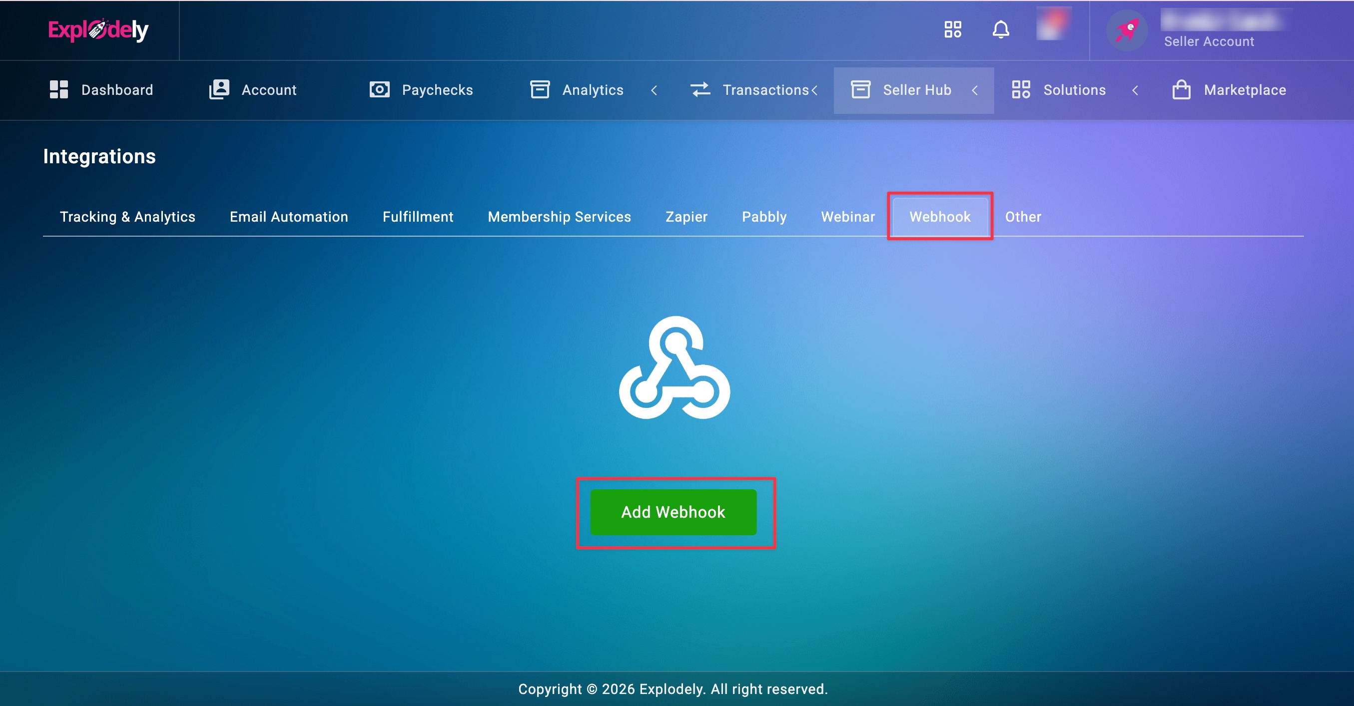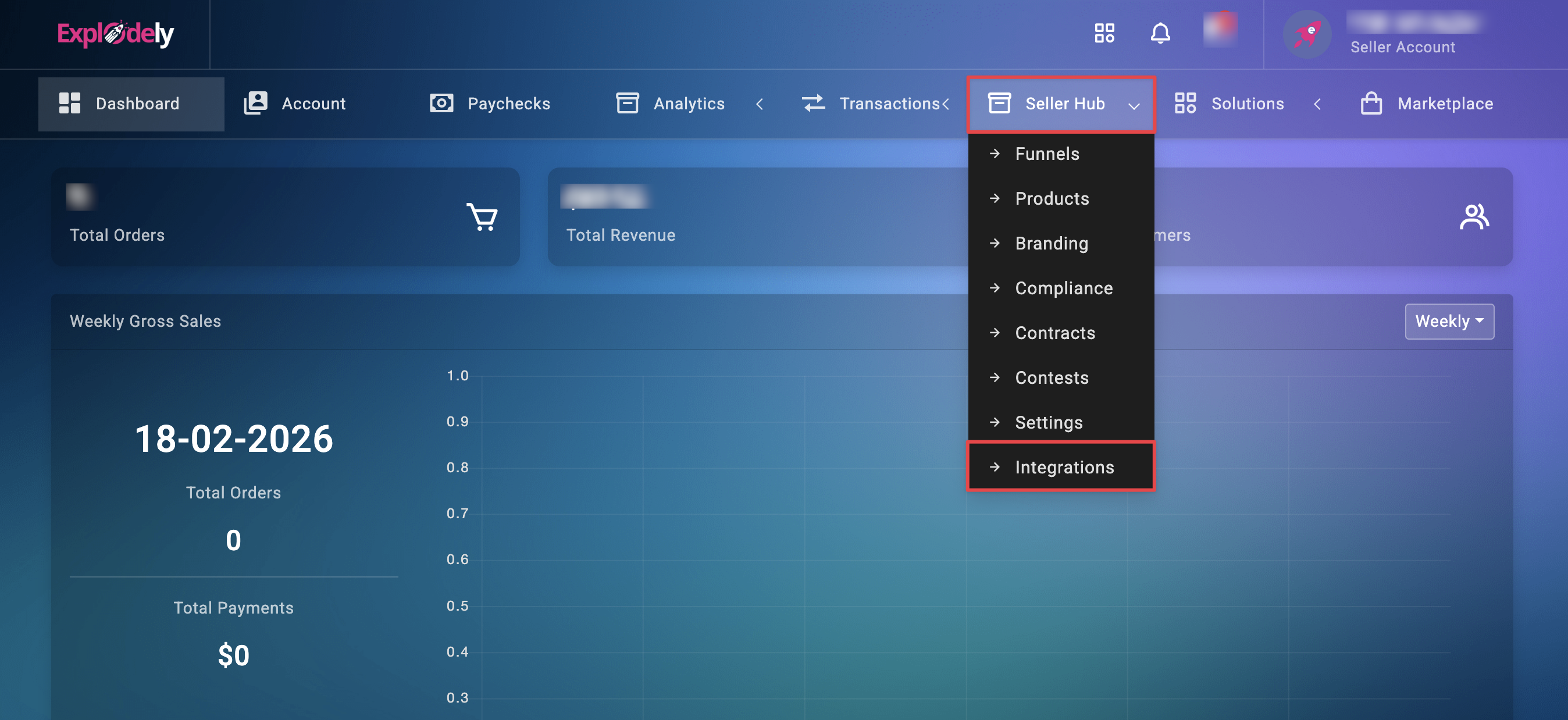 Step 1: Log in to your Explodely Seller account and navigate to Seller Hub → Integrations.