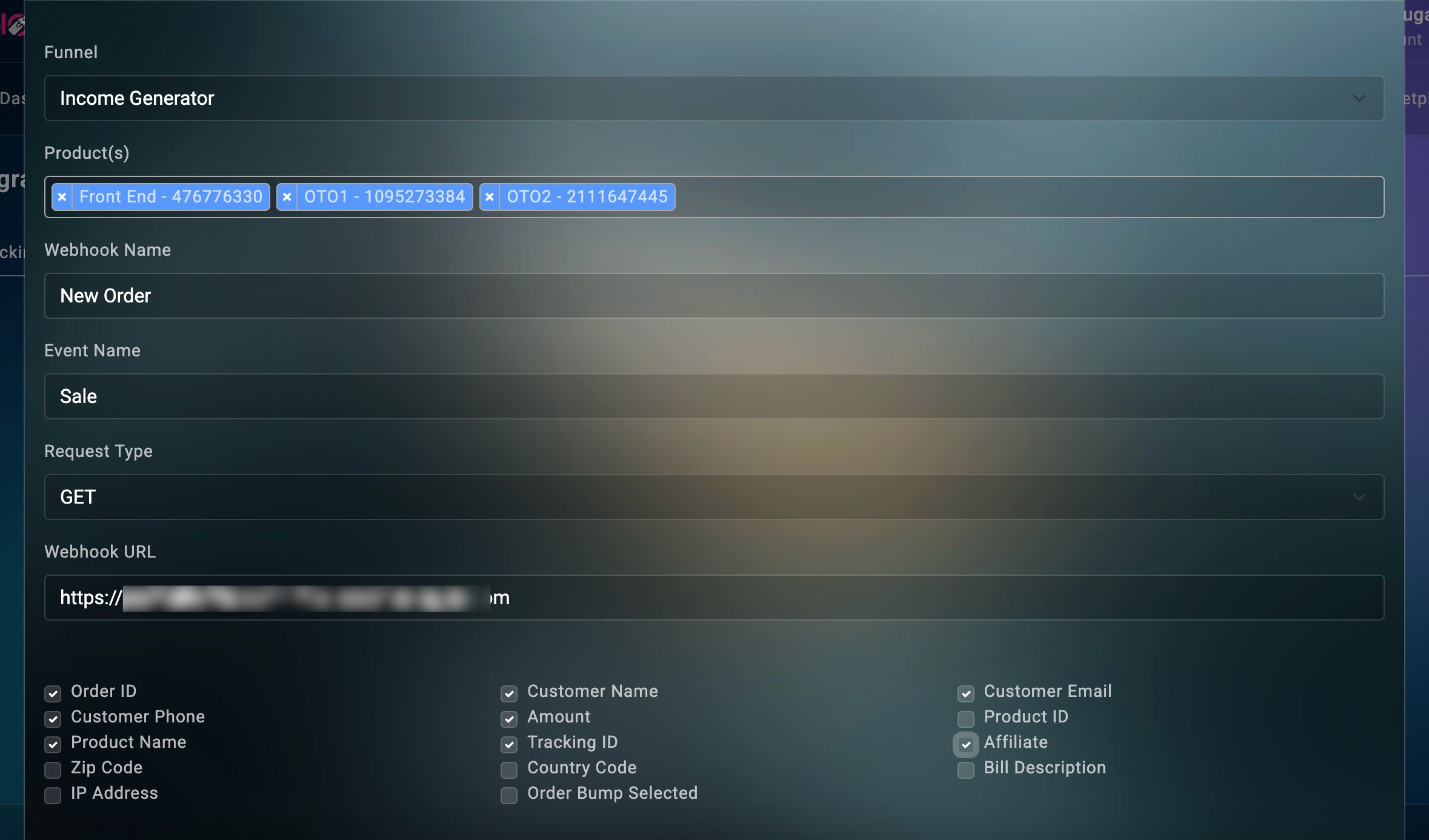 Step 3: Fill in the required details for your webhook setup like, Webhook Name, Webhook URL, Funnel and Products.