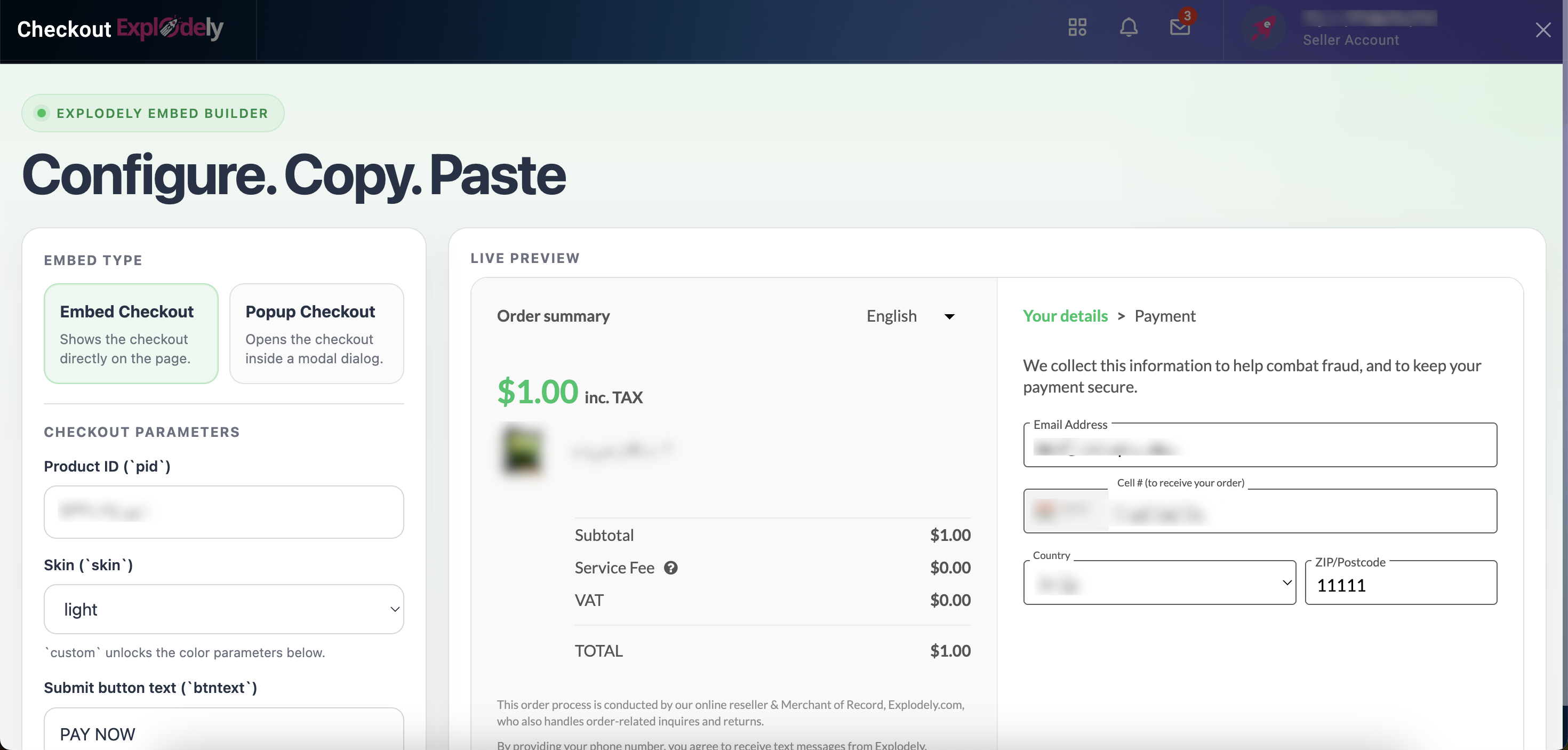 The Custom Checkout Builder in Explodely lets you create a smooth checkout experience directly on your own website. Instead of sending buyers to Explodely’s domain, you can either embed the checkout on your own sales page or show it as a pop-up when someone clicks a button.